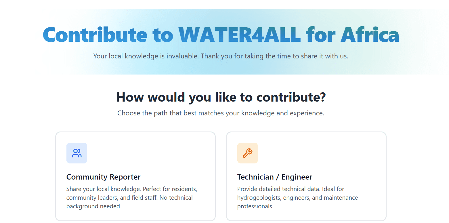 ou don’t need to be a water engineer or a drilling expert to help bring clean water to Africa. Our new data contribution form is designed for everyone, whether you’re a community member, a student, a parent, or a professional. All voices and experiences matter. Even basic information about your household’s water situation, your neighborhood’s challenges, or your observations about local sources can help us build a clearer and more comprehensive map of water needs and successes across the continent.